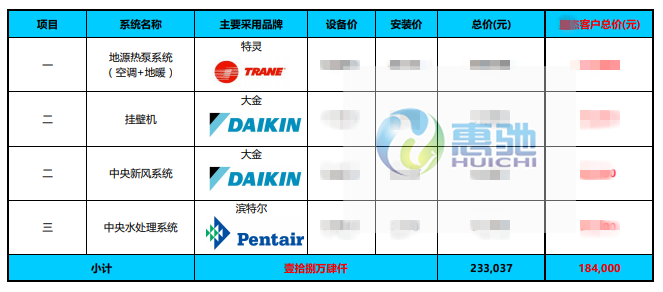 家居集成系統: 特靈地源熱泵 大金掛壁機 大金全熱交換器/新風系統 濱特爾中央凈水