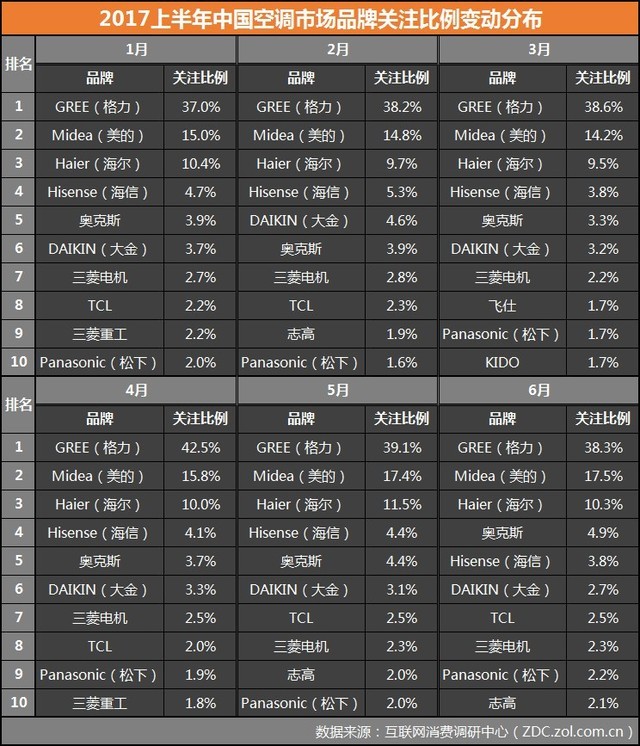 2017上半年中國空調(diào)市場品牌關(guān)注比例變動分布